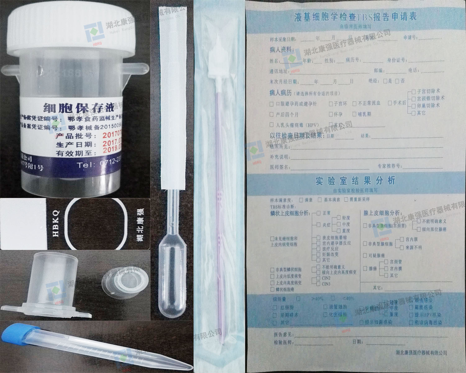 細胞保存液、粘附載玻片、沉降倉、過濾吸管、離心管、一次性宮頸采集刷、申請單