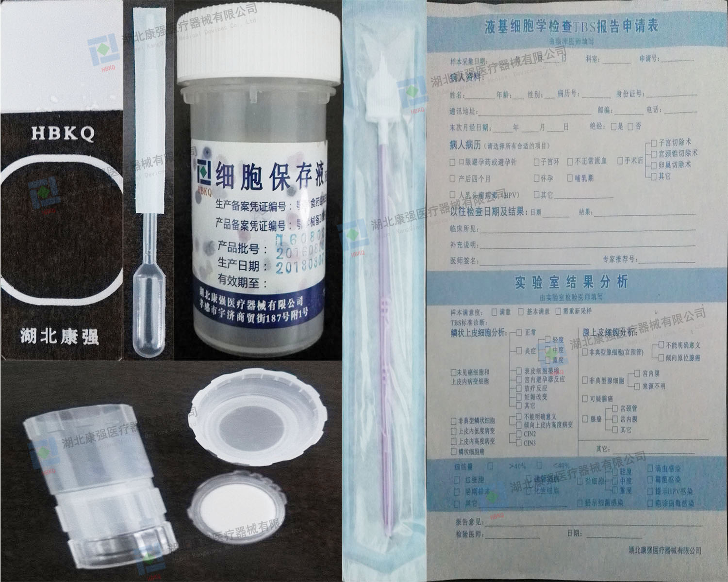 細胞保存液、粘附載玻片、專用膜杯、一次性宮頸采集刷、過濾滴管、申請單