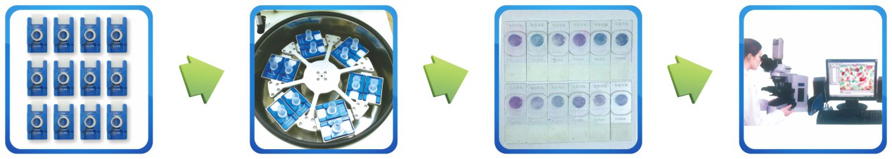 利用細(xì)胞自然沉降原理和離心力加速細(xì)胞沉降,2分鐘內(nèi)使細(xì)胞快速粘附在玻片上,制成薄層細(xì)胞片,制片效果同沉降機,但制片速度快幾倍,且陽性檢出率高。