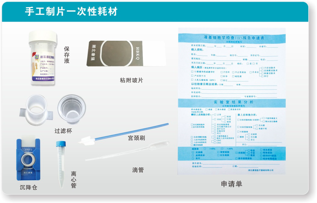 細(xì)胞保存液、粘附載玻片、沉降倉(cāng)、過濾吸管、離心管、一次性宮頸采集刷、申請(qǐng)單